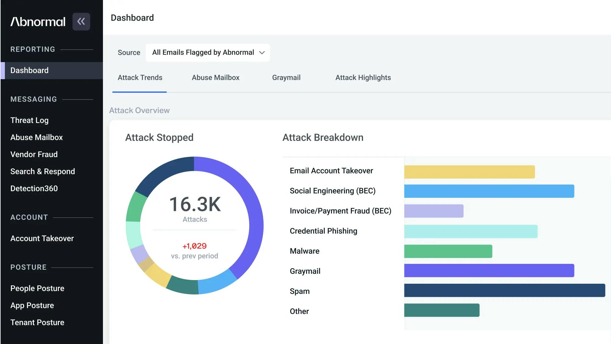 Reporting: Abnormal also provides visual reports of historical attack metrics with trending data and additional insights.