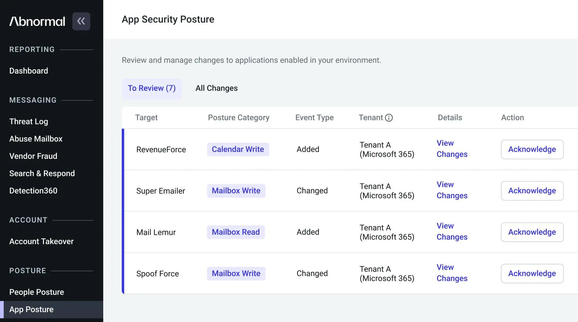 Abnormal attempts to solve this issue by building behavioral profiles across environments in Knowledge Bases and operationalizing this data to surface changes in app permissions and user privileges. Surfacing high-impact changes to accounts, applications, and tenants eliminates the need for quarterly audios, PowerShell scripts, or spreadsheets.