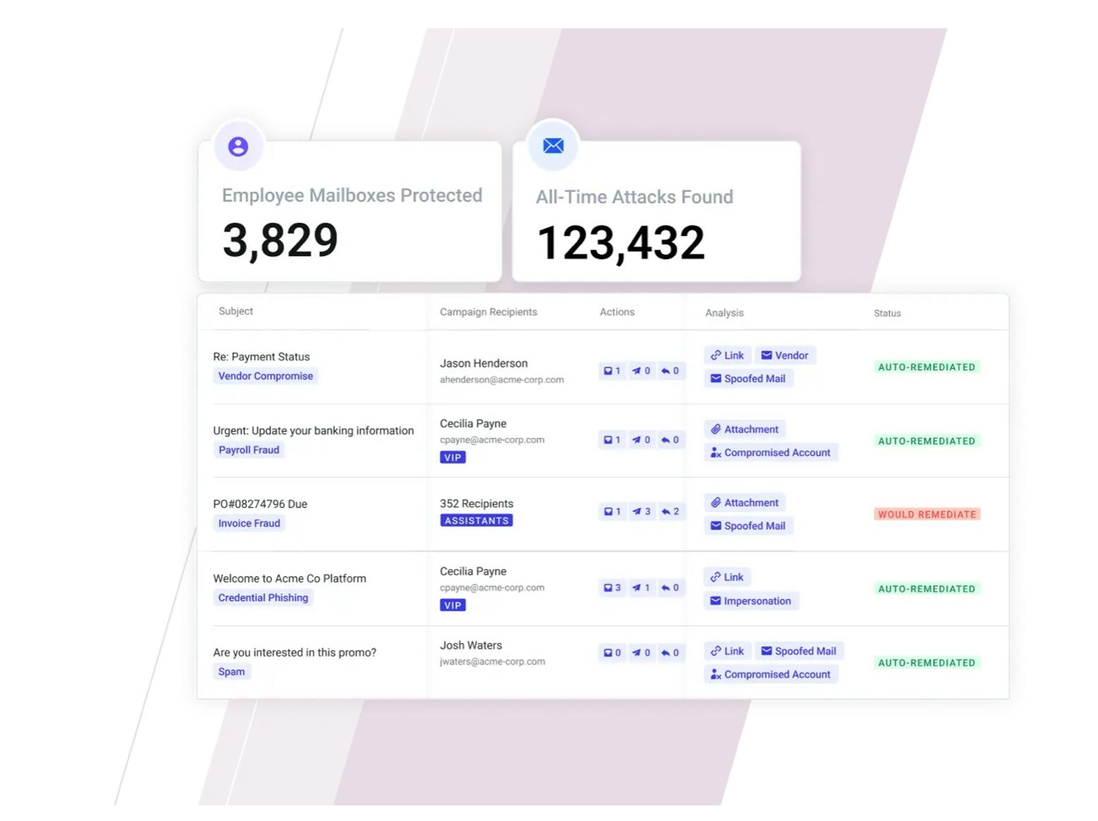 The company uses behavioral AI to help stop a spectrum of targeted attacks. It claims it can detect “never before seen” attacks with its ability to detect anomalous behavior; as the company puts it, it can do this with “no traditional indicators of compromise by analyzing tens of thousands of unique signals to detect anomalies in email messages.”