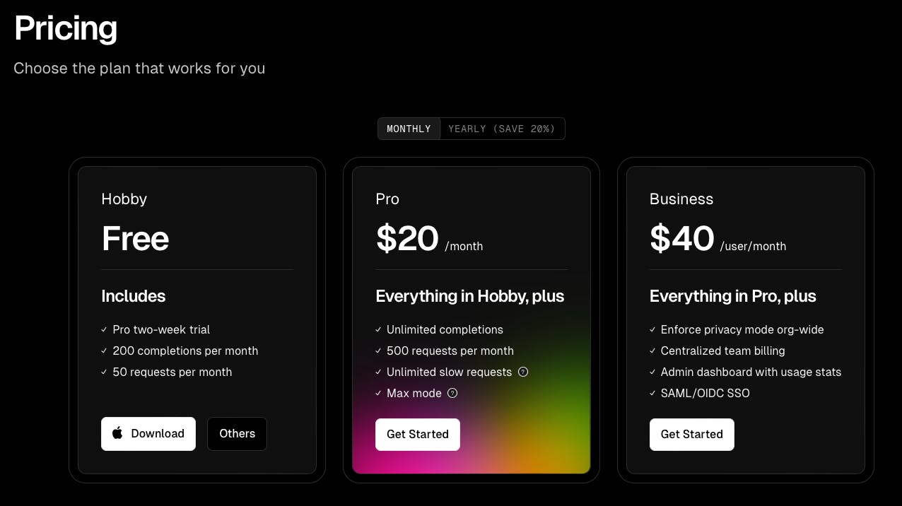 Cursor operates on a subscription-based, freemium SaaS model. It monetizes through usage-based pricing, paid subscription tiers, and enterprise offerings. As of June 2025, it offered three main plans: Hobby (free), Pro ($20 per month), and Business ($40 per user per month). The free Hobby tier includes 200 code completions and 50 premium AI requests each month. The Pro plan includes unlimited completions, 500 fast premium requests, and unlimited slow requests. Cursor also offers a 14-day free trial of the Pro plan, which includes 150 fast premium requests. The Business plan adds support for organizational privacy mode, team billing, usage dashboards, and SAML/OIDC SSO compliance.