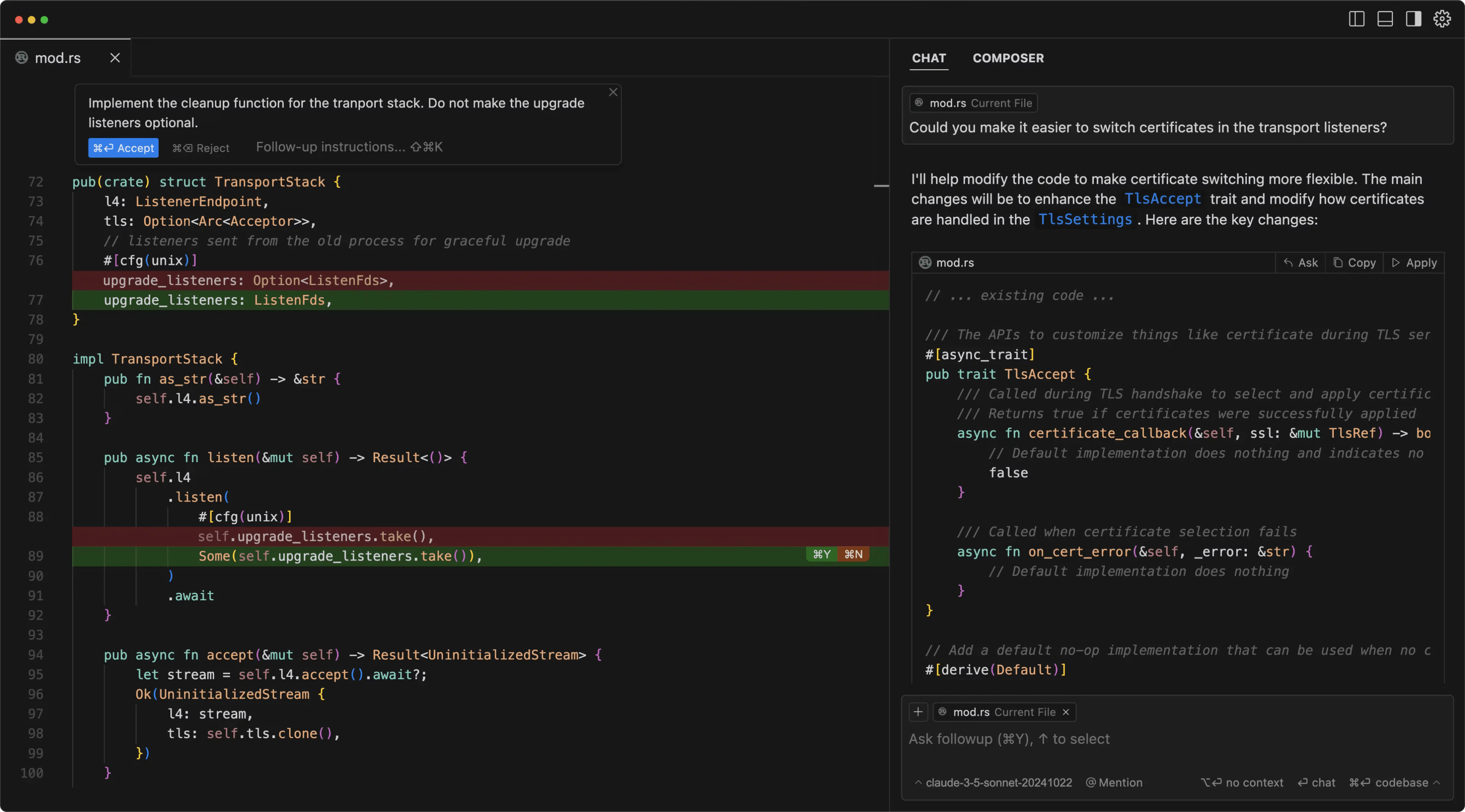 The system caches through AWS to accelerate re-indexing and supports incremental updates, which helps the tool stay responsive even as the codebase evolves. To maintain stability and ensure access to the latest features and bug fixes, Cursor regularly rebases its code on the newest versions of Visual Studio Code.