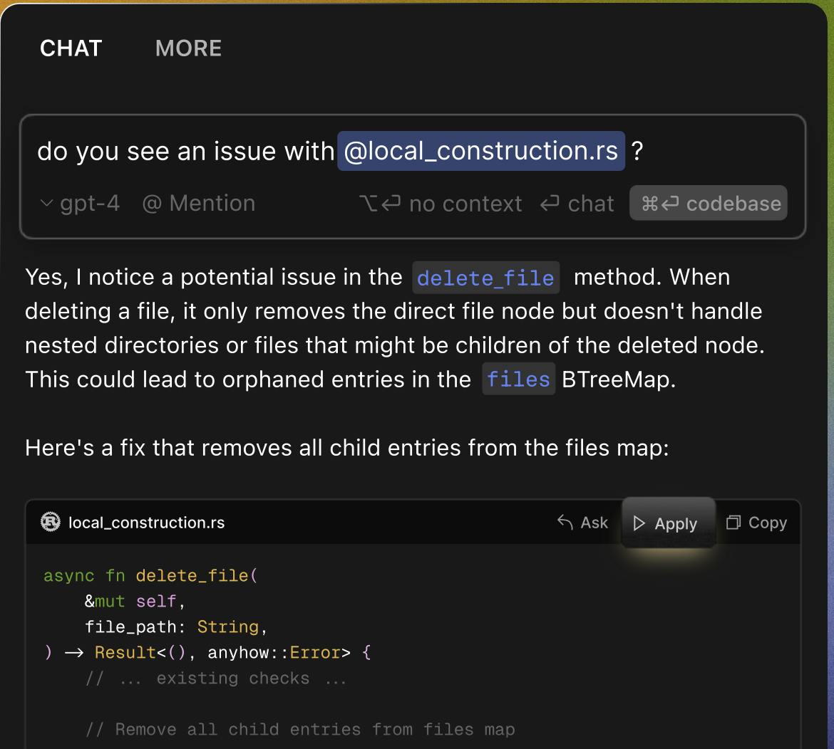 Cursor’s key architectural addition to VS Code is its Retrieval-Augmented Generation (RAG) system, which allows its AI to navigate and work across large codebases. RAG works by generating a Merkle tree, a data structure made up of hashes, that tracks changes to files. Rather than re-uploading the entire codebase during each interaction, Cursor only uploads files that have changed, minimizing latency and bandwidth use.