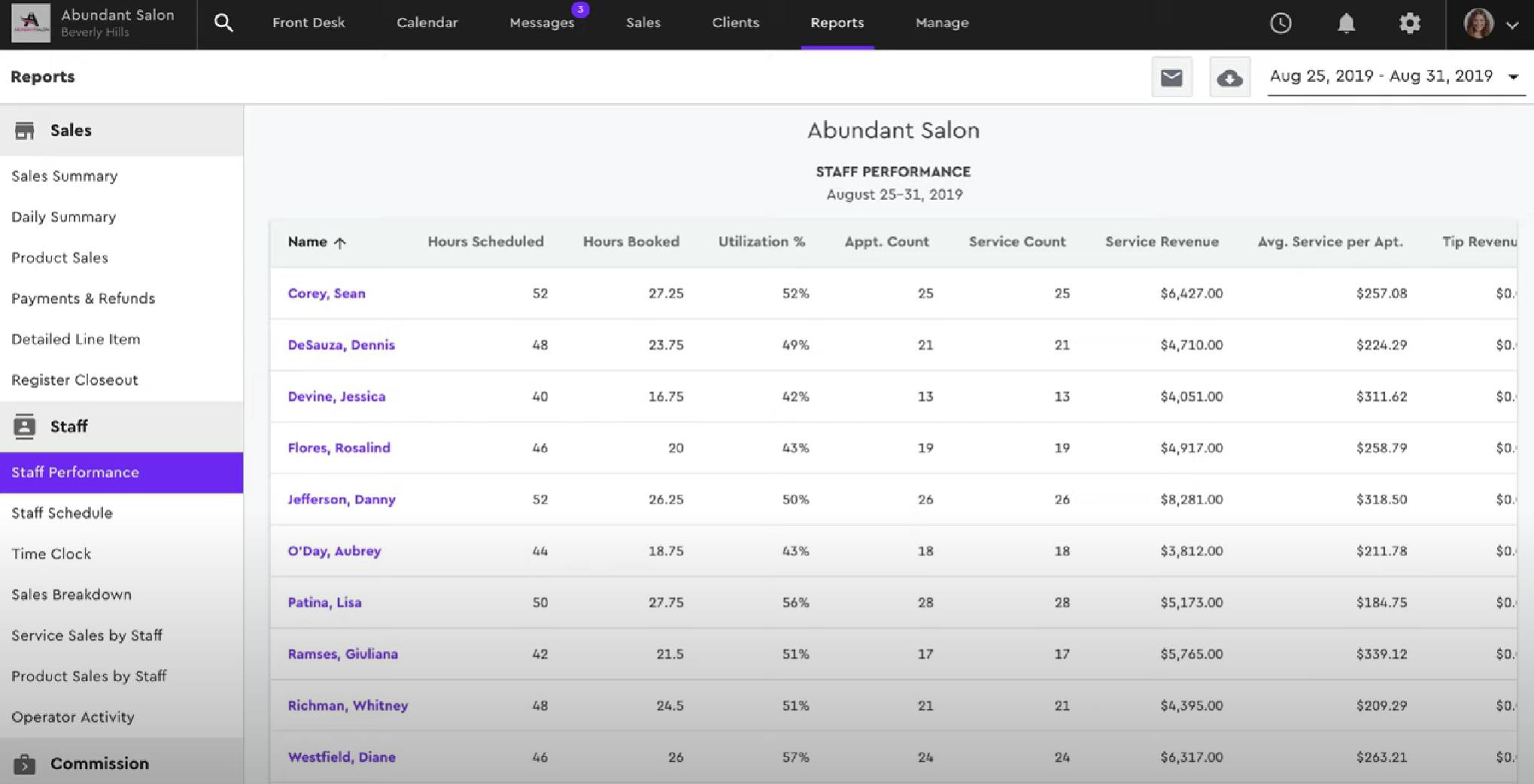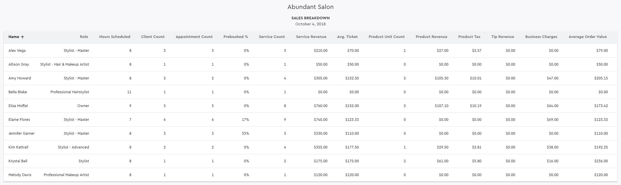 Users can also gather and export a similar sales breakdown report. Key metrics include client count, average service/order revenue, and appointment count.