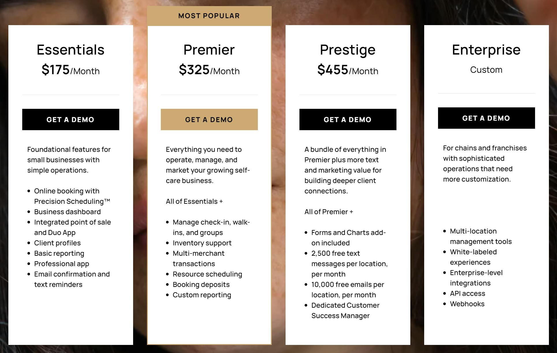 - Essentials: This tier costs $175 per month and includes the Precision Scheduling offering for online booking, a business dashboard, integrated point of sale (Duo), a client profile dashboard with 500 free one-time blast emails, and basic reporting capabilities.