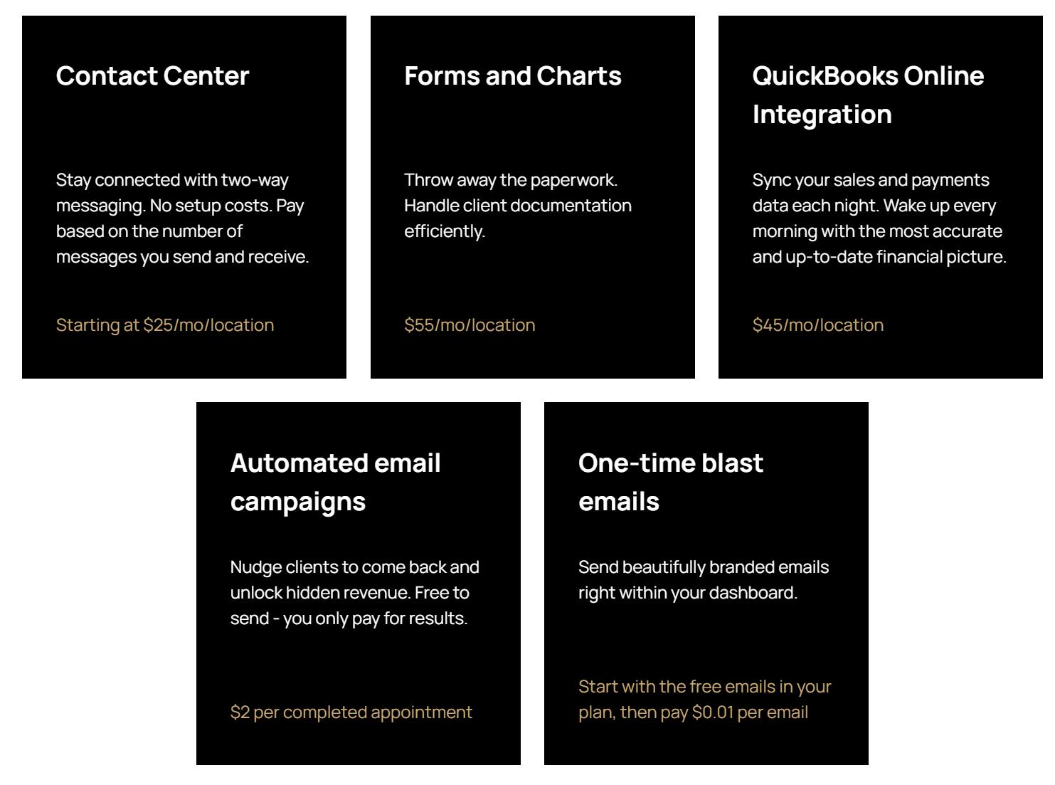 In addition to its tiered plans, Boulevard also offers individual add-ons for additional monthly fees.