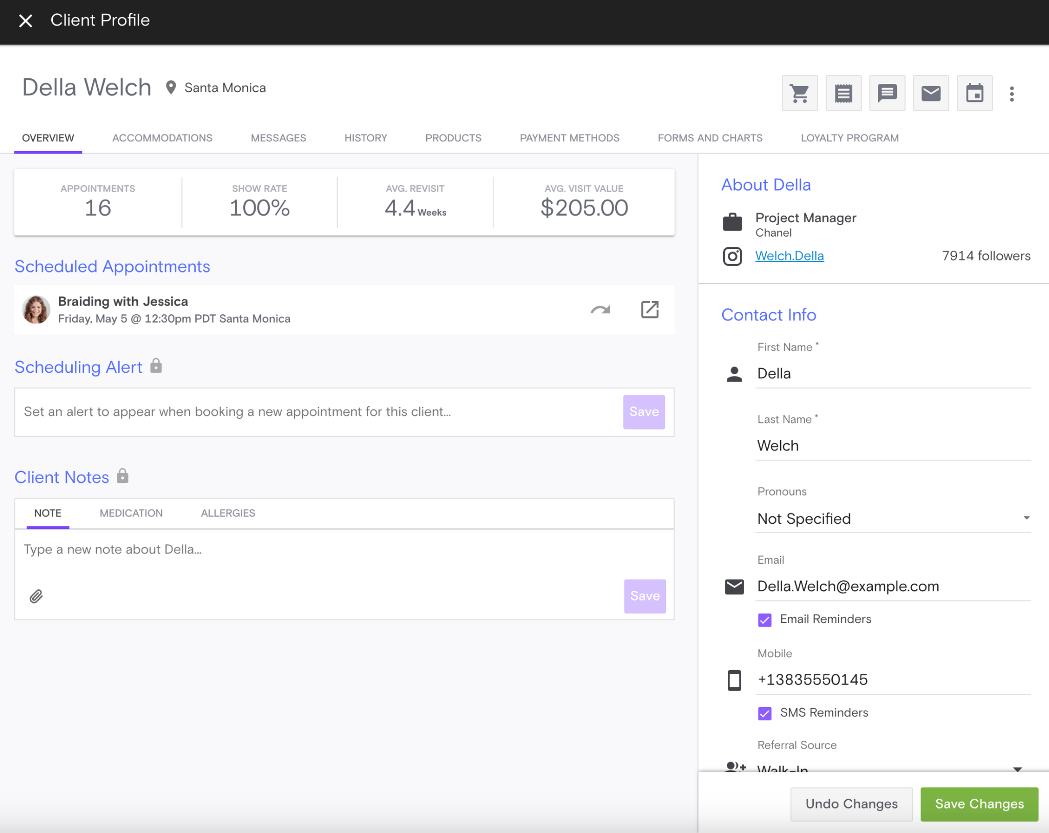 The crux of Boulevard’s platform is the data it stores to analyze each customer. In addition to the data needed to schedule a customer (historical visits, past stylist, visit duration, likelihood of no-show/lateness), Boulevard also stores relevant personal information including contact information, pronouns, expected revisit period, social links, and involvement in loyalty programs, allowing clients to strengthen the personal connection they have with their customers.