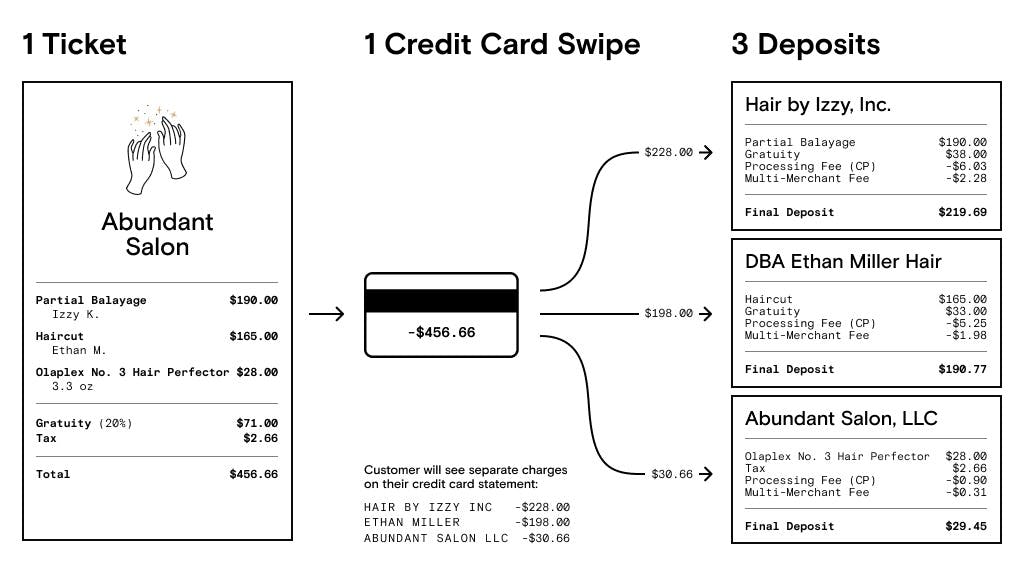 Boulevard’s platform is multi-merchant compatible for commissioned stylists operating under a larger salon, allowing checkouts to be automatically split into separate deposits.