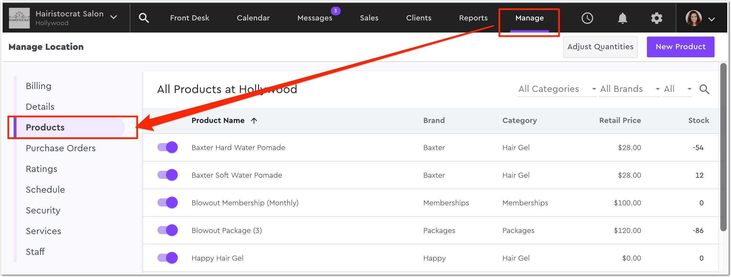 Businesses can manage product pricing and inventory directly on Boulevard’s dashboard. The dashboard can be integrated with Shopify/Quickbooks to easily migrate product lists. By manually adding/importing products into the database, Boulevard automatically tracks purchases and returns on these products.