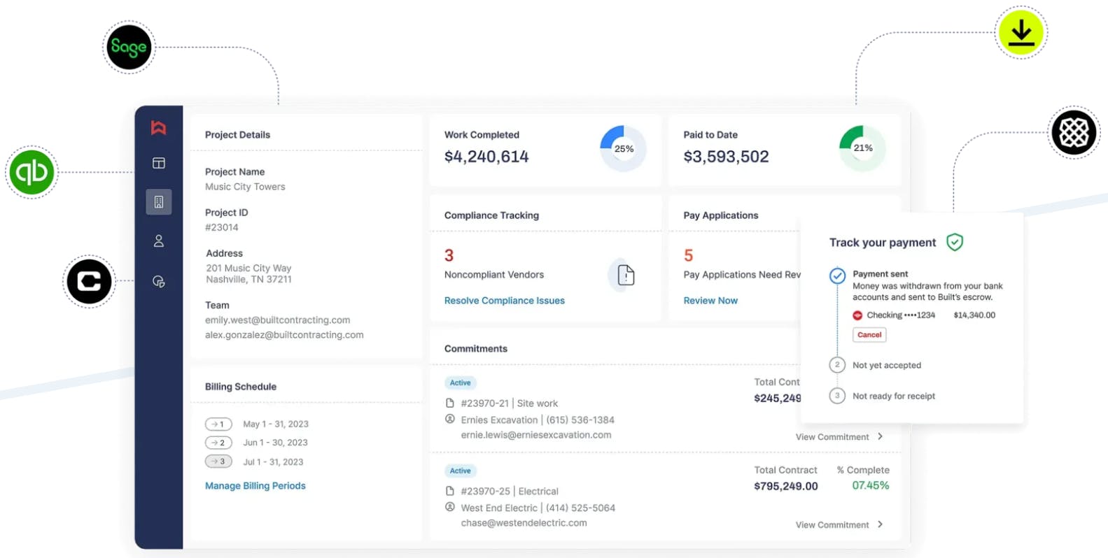 Built operates a subscription-based model, though details on pricing are not public. One external source suggests that pricing for contractors is based on project revenue volume managed on Built’s platform while for subcontracts it is based on contract value. Built is also likely to generate revenue from implementation and customization services for clients requiring specific software setup support. It also may charge extra fees for integrations with third-party software providers such as Quickbooks and DocuSign, which the company partners with.