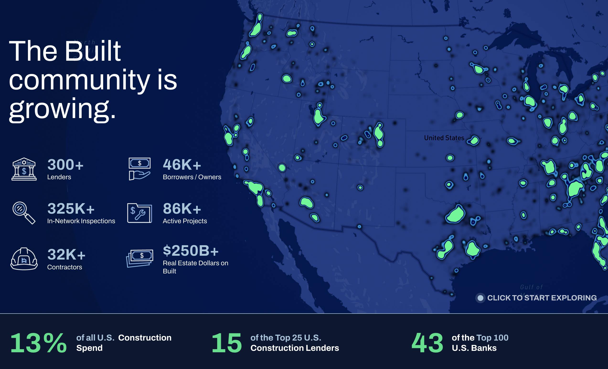 As of March 2024, Built had a quarter of a trillion dollars in real estate being actively managed on its platform, representing approximately 13% of all U.S. construction spend. It has managed over 200K projects at a value of $135 billion, serving more than 46K borrowers, over 32K contractors, and over 300 lenders as of March 2025.