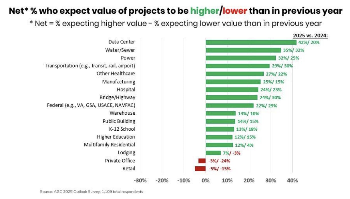 Over the course of 2025, residential construction is expected to grow 12%, while nonresidential construction is expected to grow 8%. Within nonresidential segments, there are clear breakouts in terms of sectors that are expected to drive larger projects in 2025 compared to 2024, such as data centers, water/sewer, and power.