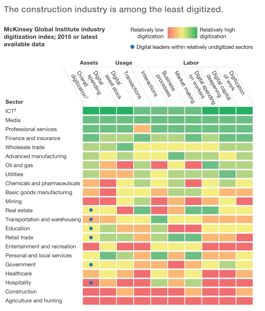Construction has historically been slow to turn to digital solutions because of continued reliance on manual processes. In 2016, construction was the second least digitized industry after agriculture.