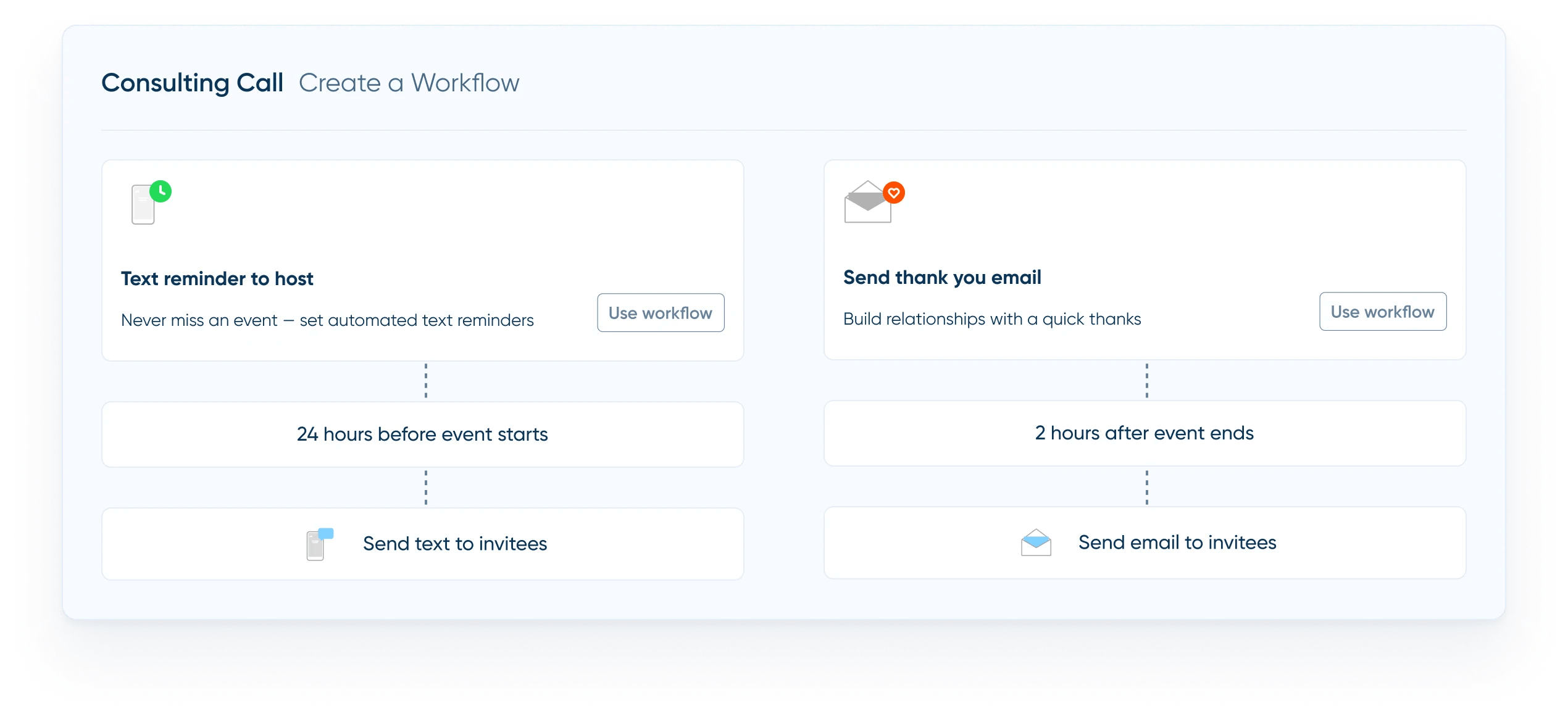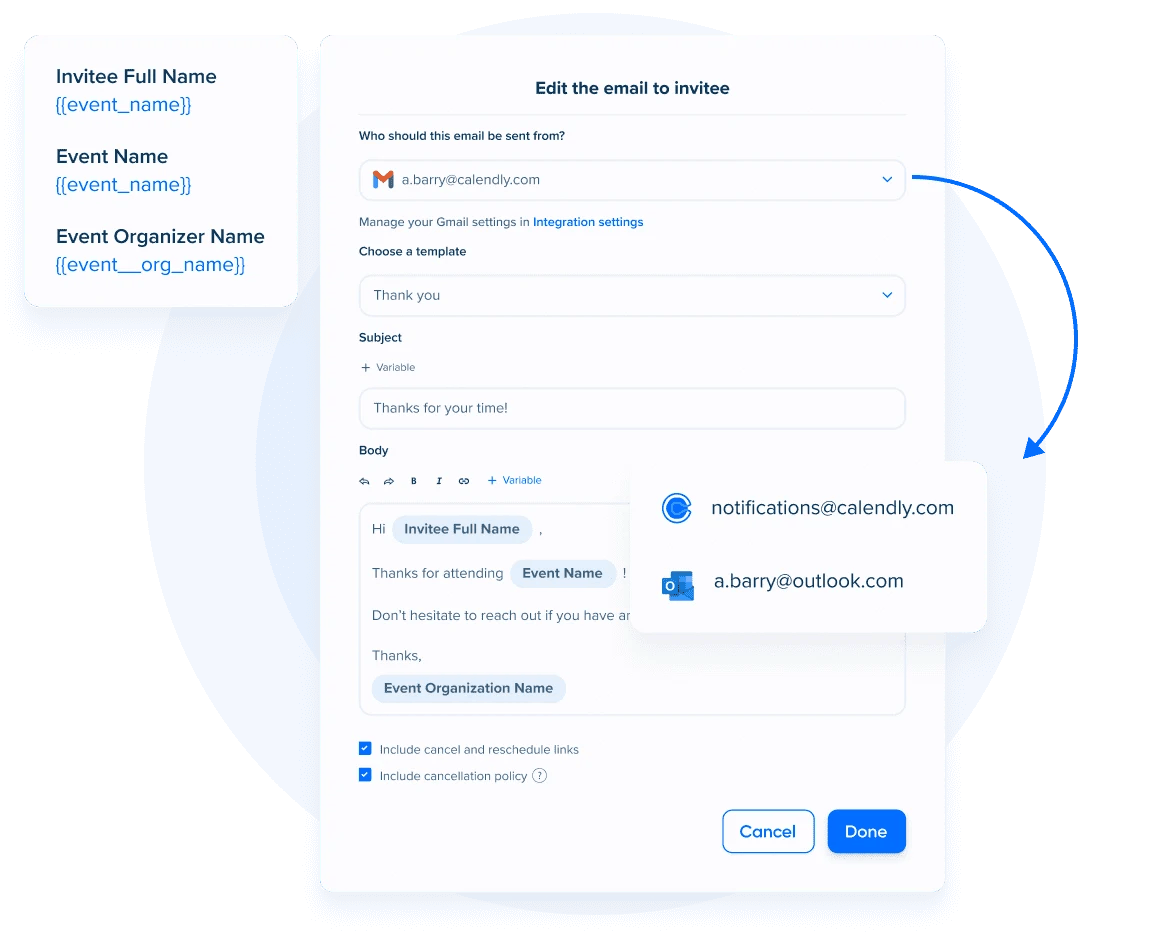 Calendly automates both reminders and follow-ups for scheduled meetings, helping to reduce no-shows and save time on post-meeting communication. This feature allows for routine communications before and after every meeting.