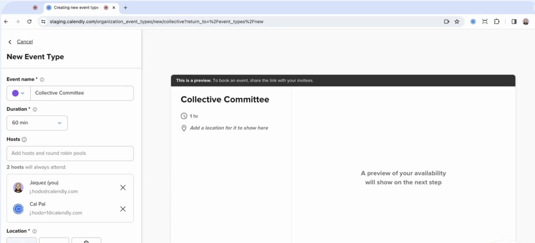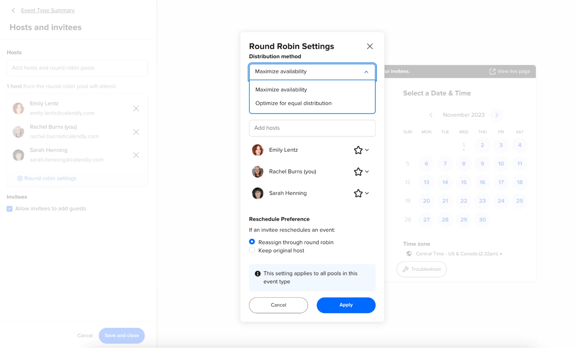 Calendly supports scheduling both group meetings and round robin events. For group meetings, it displays the time slots when all selected hosts are available simultaneously, ensuring convenient scheduling for invitees.