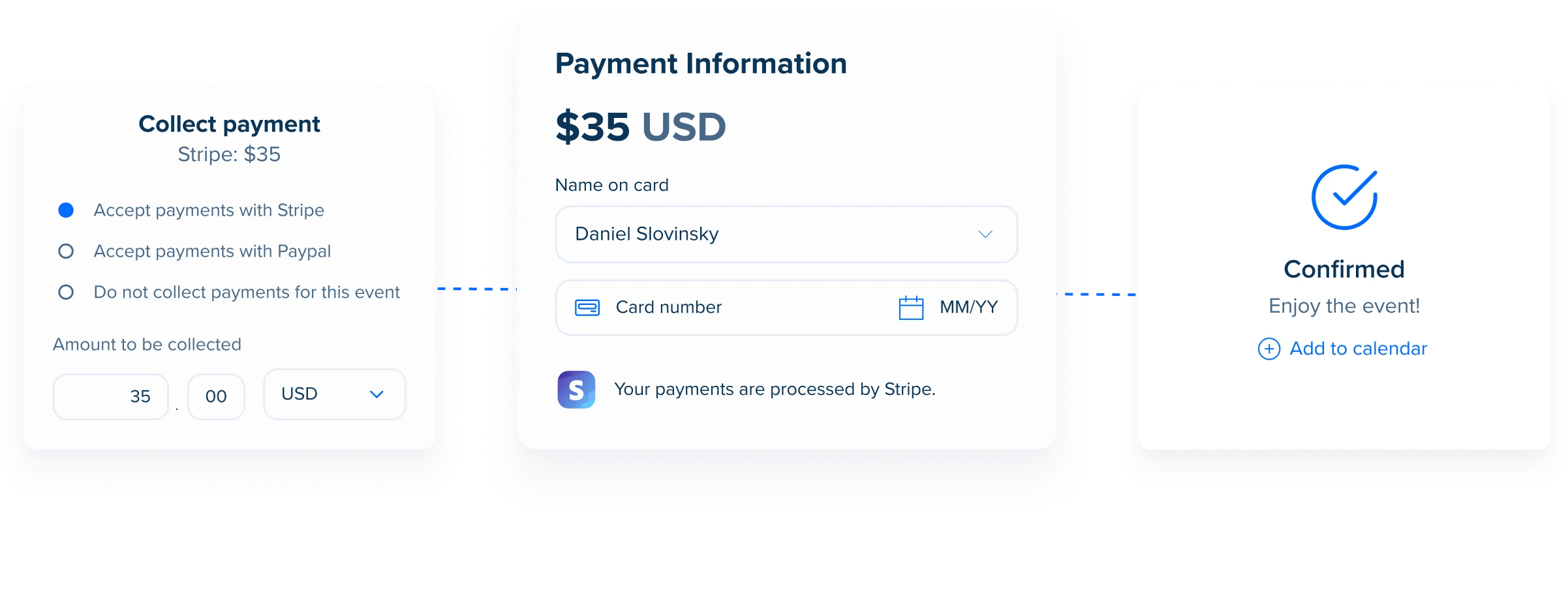 Calendly allows users to collect payments when a meeting is scheduled. Transactions can be processed through platforms such as Stripe, PayPal, or Stax. This payment requirement also reduces the likelihood of no-shows, as invitees have a financial stake in attending. After a meeting is scheduled, receipts are automatically generated, and users can issue refunds directly through the platform.