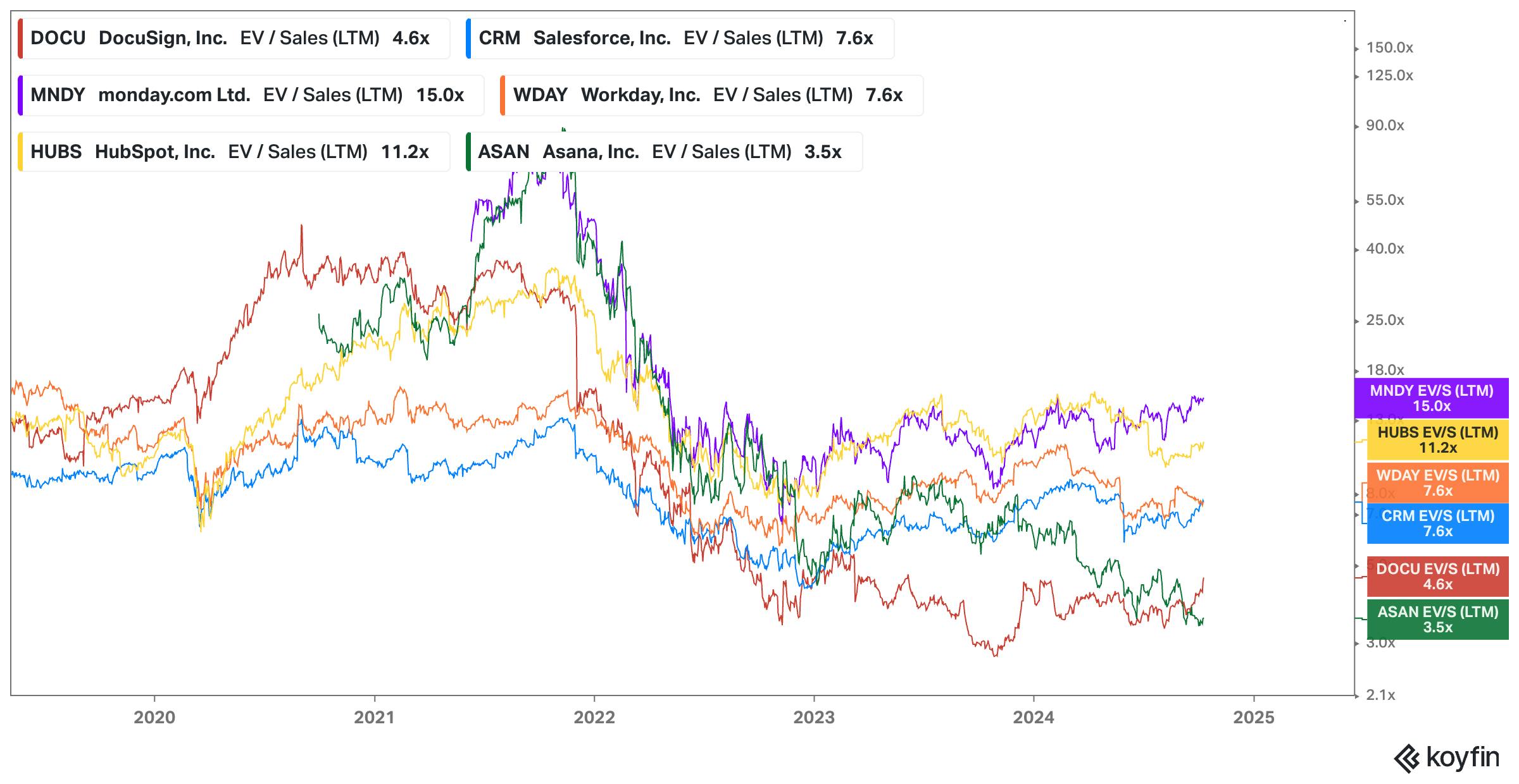 In 2020, Calendly generated $70 million in revenue, resulting in a ~42.9x revenue multiple. As an enterprise software tool with a seat-based pricing model, it can be compared to companies like Workday, HubSpot, Salesforce, Monday.com, Asana, and DocuSign. These companies, as of October 2024, had revenue multiples which ranged from 3.5x to 15x. This suggests that Calendly’s investors were potentially willing to pay a premium for each dollar in sales due to its placing outside of the range of the comps’ multiples when the last round was raised in 2021.