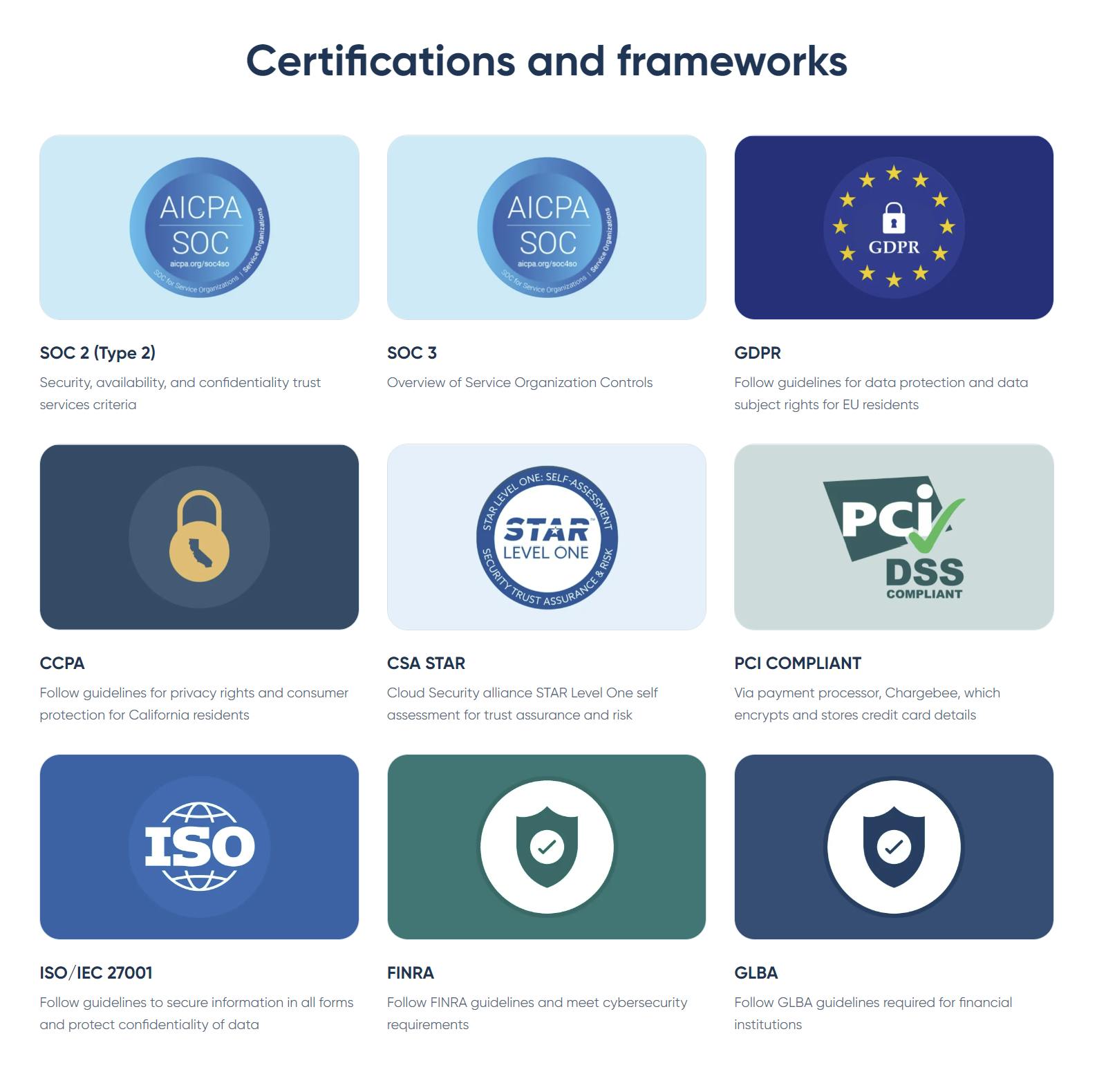 Calendly's security features make it suitable for enterprise use, including certifications such as SOC 2, GDPR, and FINRA. These certifications ensure compliance with data governance standards across various industries and regions, providing organizations with confidence in the platform's ability to protect sensitive information.