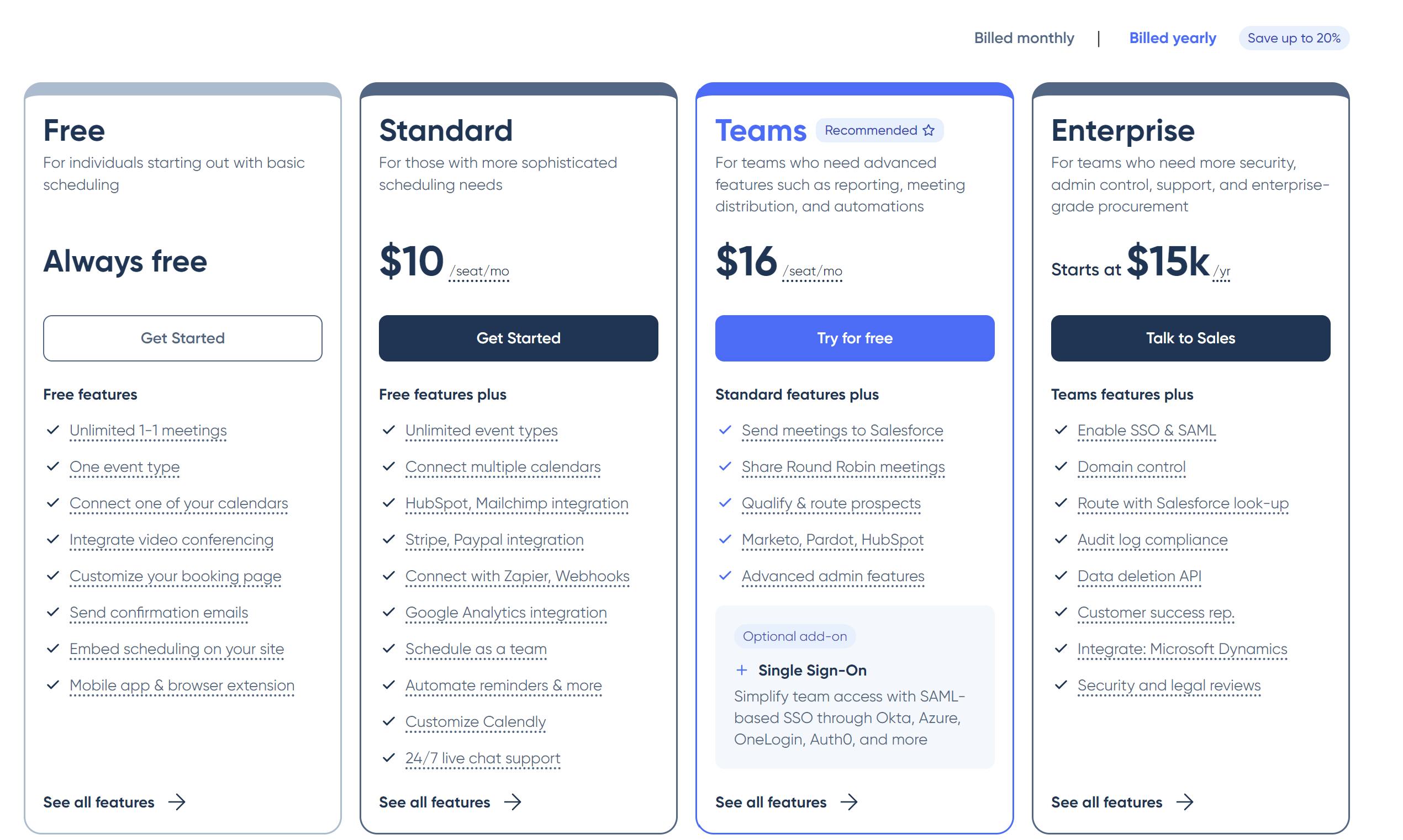 Teams: Teams can be purchased for $16 per month per person, and offers additional features like CRM integrations, sharing round-robin meetings, or accessing routing forms.
