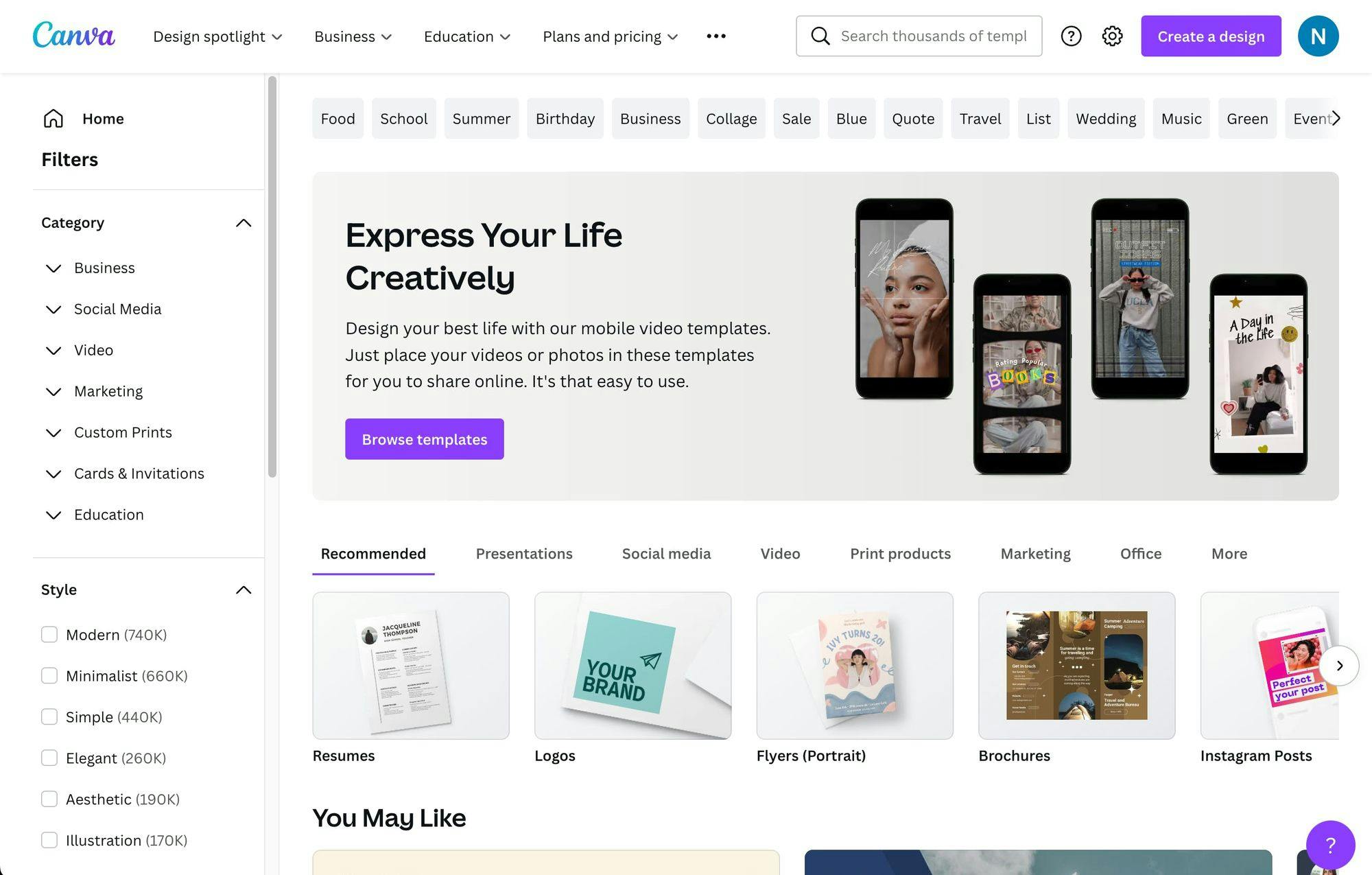 Adobe Express is the digital design platform competing against Canva Design. Graphics that users can create include social media content, videos, flyers, resumes, banners, logos, and single-page websites. Like Canva, Adobe Express offers customizable templates and is designed to be simple to use for beginners in graphic design.