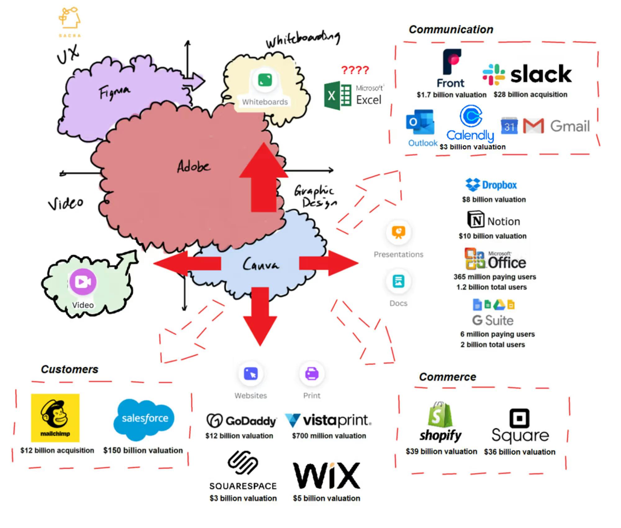 Adobe: Adobe, founded in 1982, is a global leader in digital media and digital marketing solutions. Based in San Jose, CA, Adobe is the primary competitor that Canva aims to disrupt. Adobe’s customer base includes freelance photographers, individuals, businesses, and schools. The company’s products include: