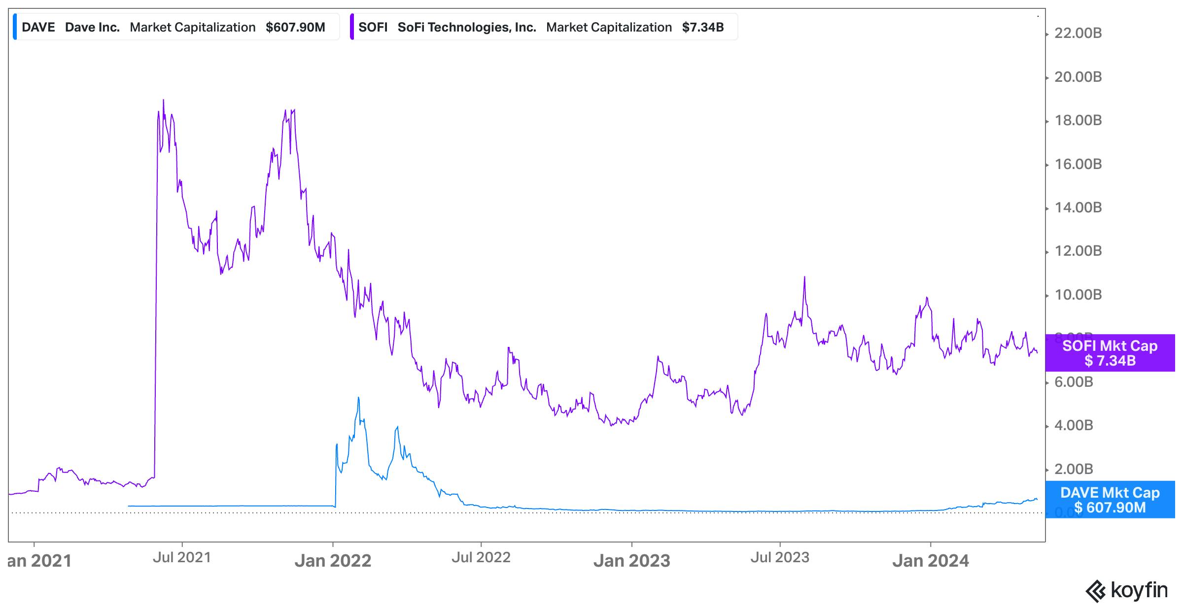 In January 2022, Dave went public via a SPAC at a market cap of ~$3 billion. It had over 8.3 million members and $204.8 million in revenue for the 2022 fiscal year. In 2023, it reported $259.1 million in revenue and the addition of 683K new members, while reducing customer acquisition costs and achieving profitability with $0.2 million in net income. However, its market cap declined significantly following its IPO; it was $657.4 million as of May 2024.