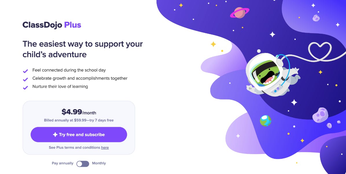 ClassDojo’s subscription plan is a premium offering for families, including unlimited messaging, access to the prior year’s memories, detailed progress reports, unlimited at-home feedback points, upgraded messaging, skill-building resources, and a family account with three additional subscriptions.