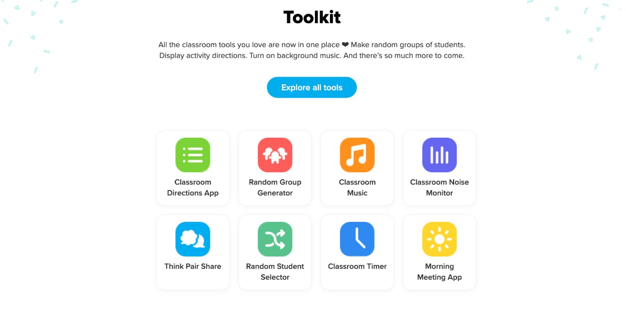 Teachers are given a toolkit with different features to manage their classrooms. The Directions feature enables teachers to create a list of activities that they can present to their students. The ‘Music’ feature provides auditory options that can promote student concentration or enhance enjoyment during designated leisure times. The ‘Group Maker’ feature creates an automated group to facilitate the arrangement of students into various groups. The ‘Think Pair Share’ feature enables one to post a prompt that fosters interactive classroom dialogue. The ‘Random’ feature is an impartial student selector useful when a volunteer is needed. The ‘Timer’ feature is a timer that can be used for time management tasks and transitions. The ‘Today’ feature allows for the efficient display of morning tasks, welcome messages, or essential announcements.