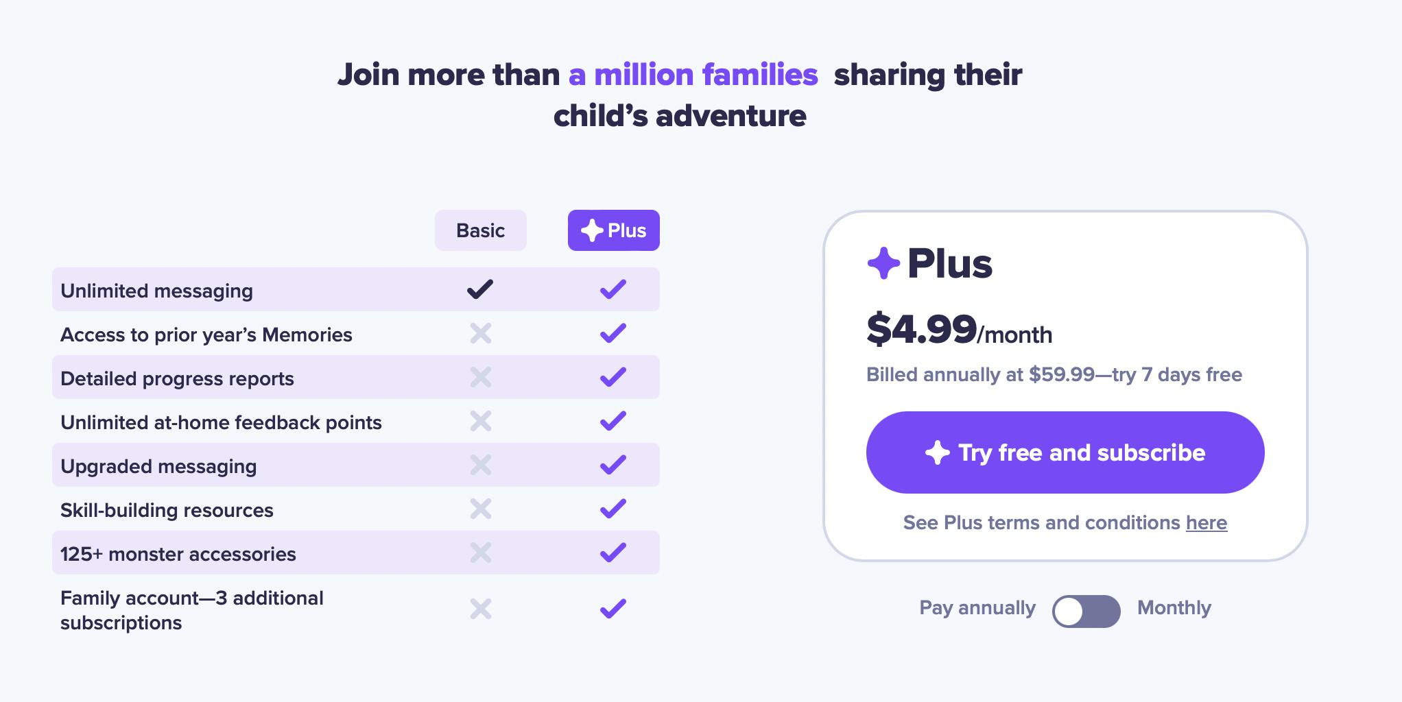 ClassDojo generates revenue through a freemium model. The company does offer an optional, paid subscription that provides additional features for families to further engage with their child’s school. Families can try ClassDojo Plus with a seven-day free trial before opting for a monthly plan that costs $4.99 or a yearly plan that costs $59.99.