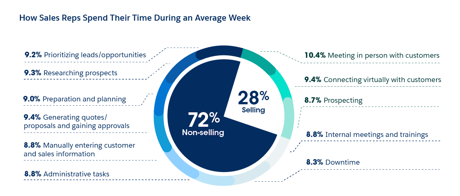 Traditional data providers can’t sell the hyper-specific data that businesses need for effective targeting. As a result, many teams fill this gap with time-intensive manual research. This causes sales representatives to have to spend less than 30% of their time actually selling, according to research from December 2022.