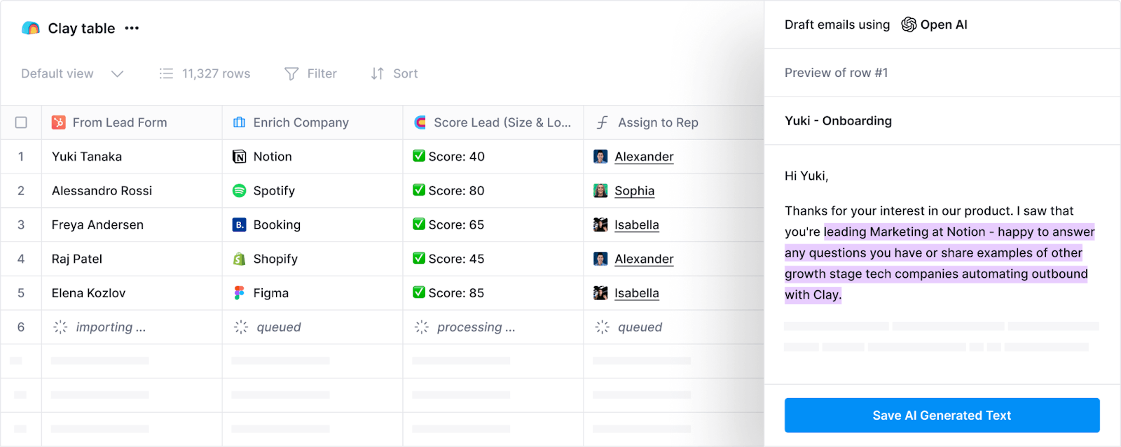 For outbound, Clay connects to sequencing tools to automatically create email and messaging campaigns based on its data. Clay customers can use AI to create detailed, individualized emails to prospective customers based on its data. For example, customers can tailor the message based on a prospective customer’s location, increasing the likelihood of that email being opened.