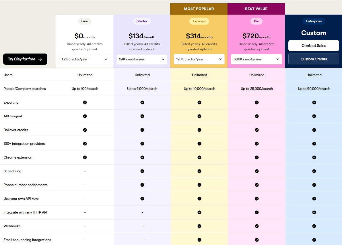 As of July 2025, Clay offers four different payment plans that vary based on the number of credits and features included. All plans come with unlimited users, exporting, rollover credits, and Claygent. Additionally, custom plans can be tailored to meet the needs of enterprise customers. Clay also offers a credit calculator to help users estimate their expected credit usage based on the actions and data they require.