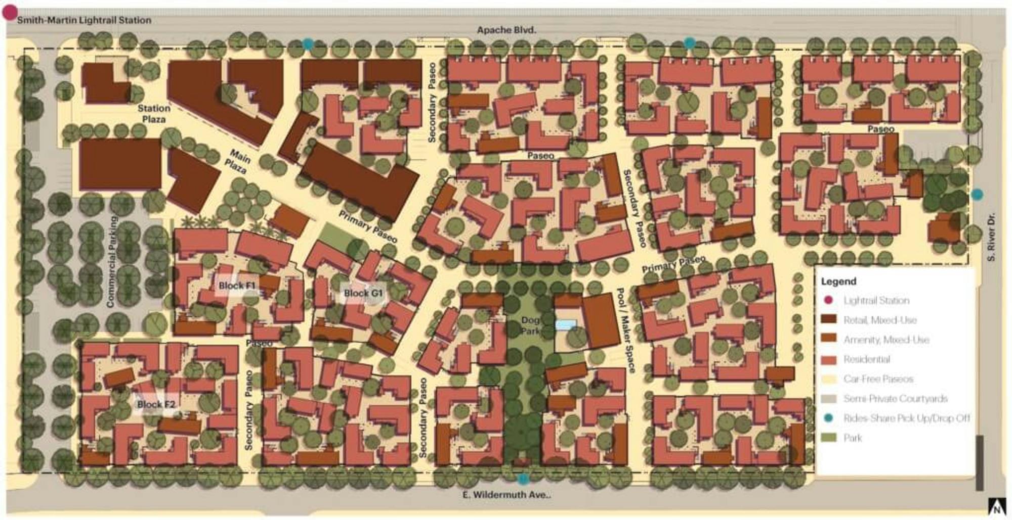 Culdesac Tempe offers multifunctional neighborhoods that serve diverse needs. A car-free neighborhood is supposed to be safer, quieter, and more walkable. Main walkways are built to be wide enough to provide access to emergency service vehicles when needed, which can get to where they need to go with more efficiency because of the lack of congestion. There is also a pool and dog park on site, as well as courtyards and other shared spaces.