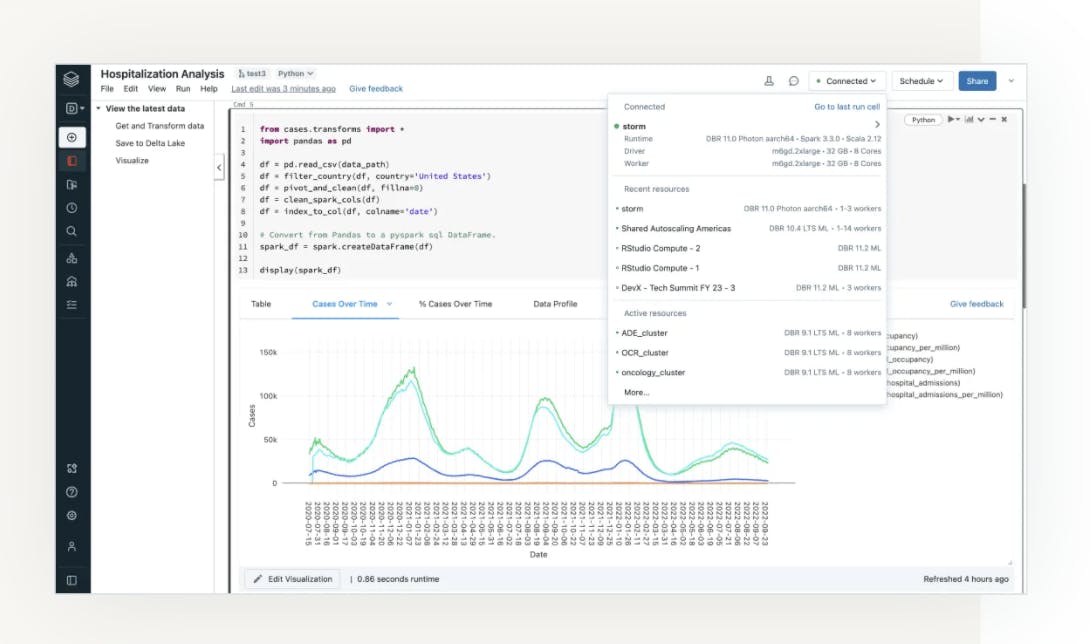 Databricks helps streamline the data science workflow end-to-end — from data preparation to modeling to sharing insights. Users can access clean data, preconfigured compute resources, IDE integration, multi-language support, and built-in visualization tools.