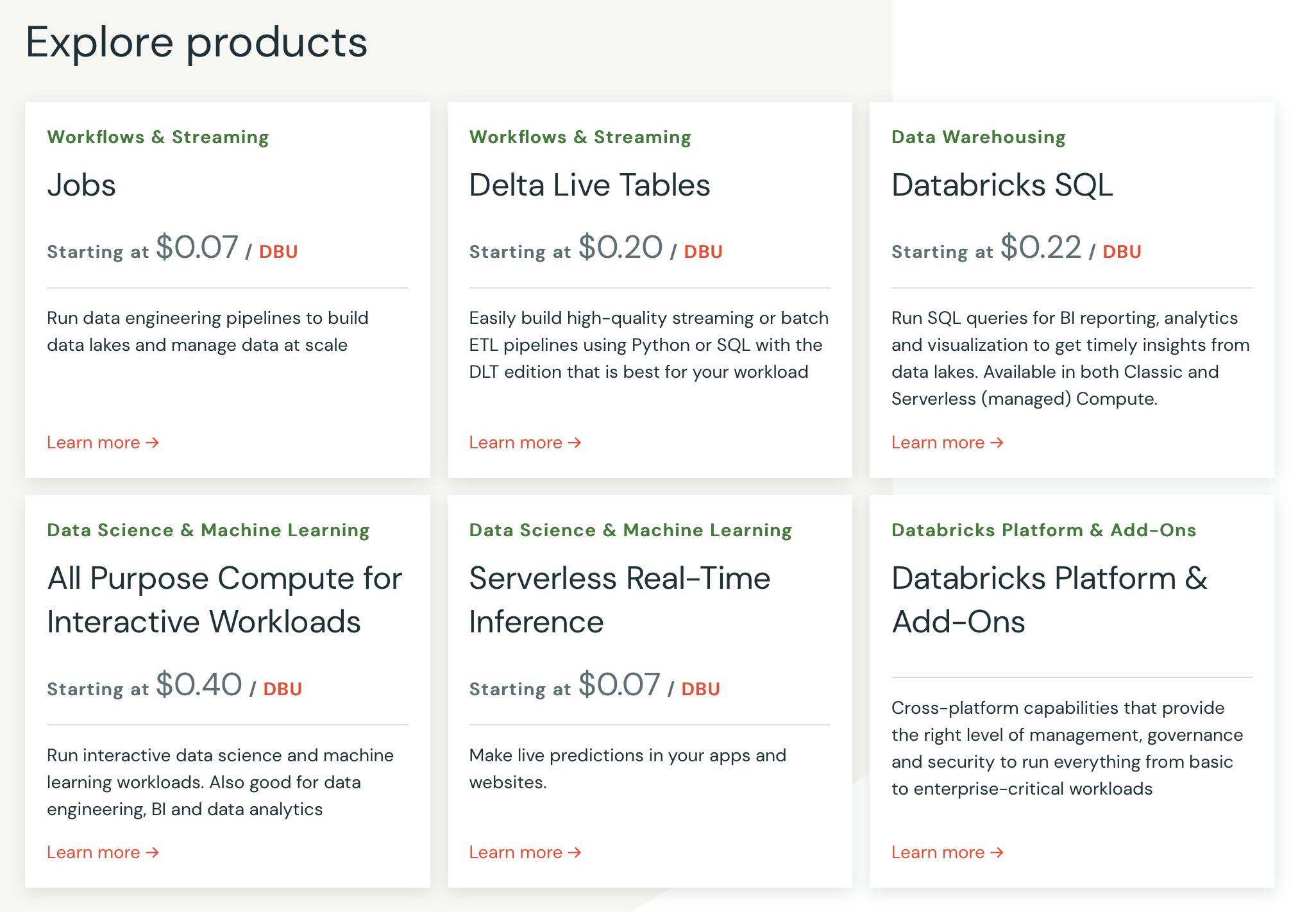Databricks offers a pay-as-you-go model where customers are charged based on how much compute resources they consume and use per-second billing to ensure customers only pay for what they need when it is needed. To measure and price the processing power, Databricks uses a normalized unit called a Databricks Unit (DBU). The number of DBUs a workload consumes is driven by several processing metrics, including the compute resources used, the amount of data processed, the region, the pricing tier, and the type of Databricks service being used.