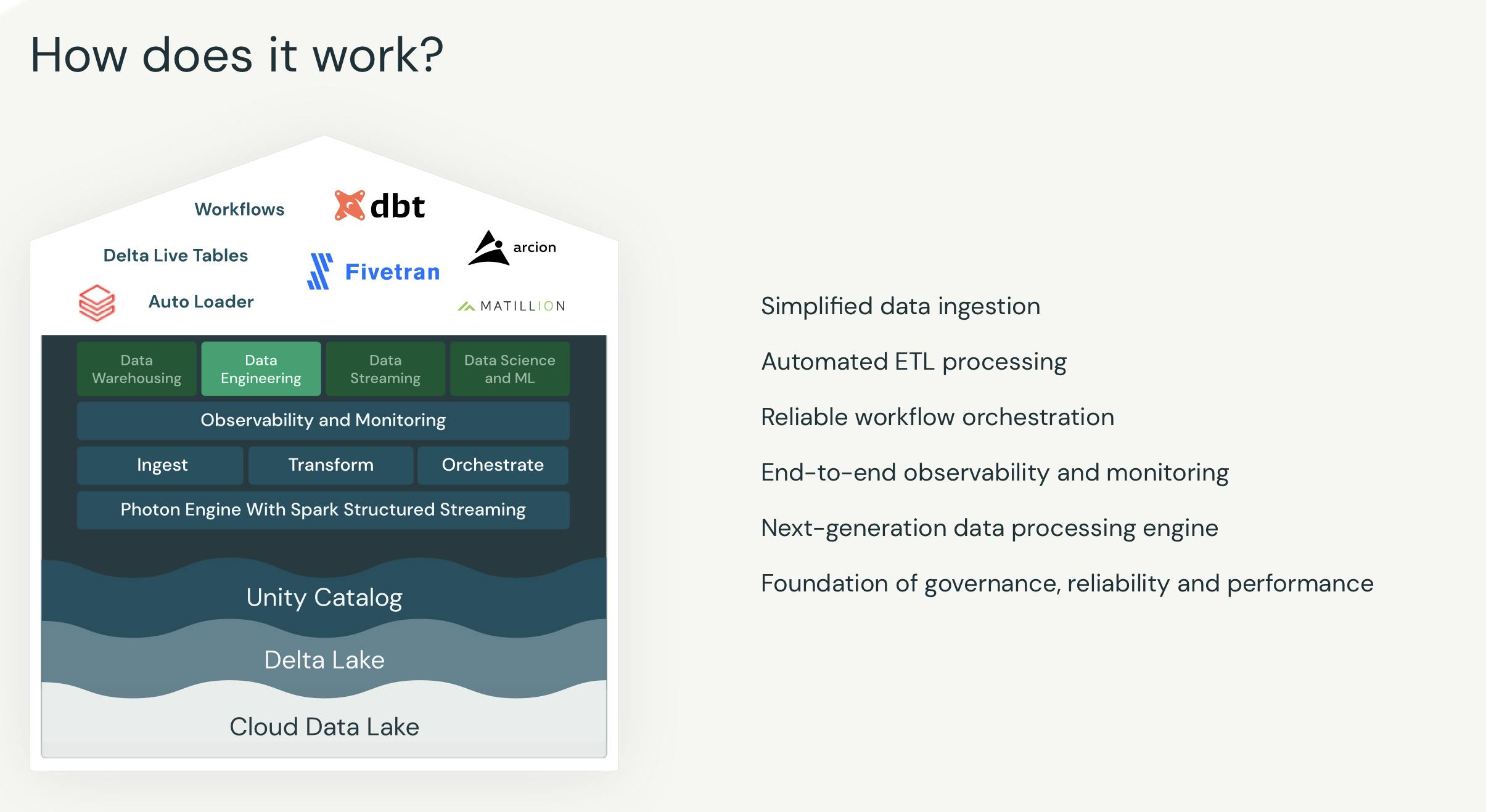 Data teams can eliminate silos with a single and unified API to ingest, transform, and incrementally process batch and streaming data. Databricks manages the customer’s infrastructure and the operational components of production workflows.