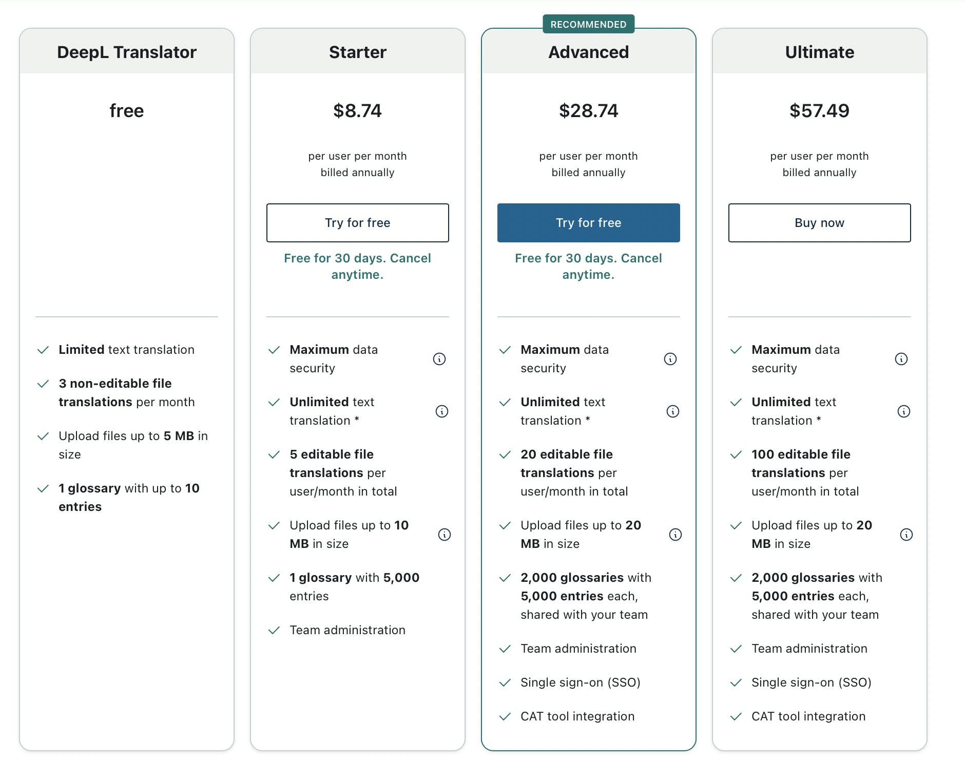 DeepL uses a freemium business model that funnels users into paid tiers. The free tier limits the number of characters a user can translate at once, the security of the user’s data, the number of documents they can translate a month, the number of glossaries they can have, and the integrations allowed. The free tier for the DeepL API, which has access to the same features, is less restrictive, allowing access to more glossaries and more translations.