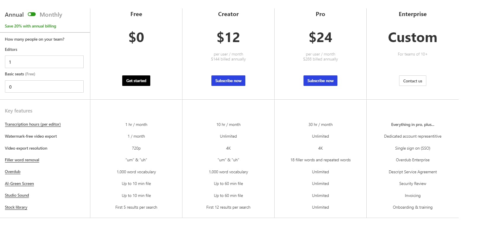 Descript operates a seat-based subscription model with a usage-based component tied to monthly transcription hours per editor. The company counts a “seat” as an editor and allows an unlimited number of “basic” seats irrespective of plan choice.