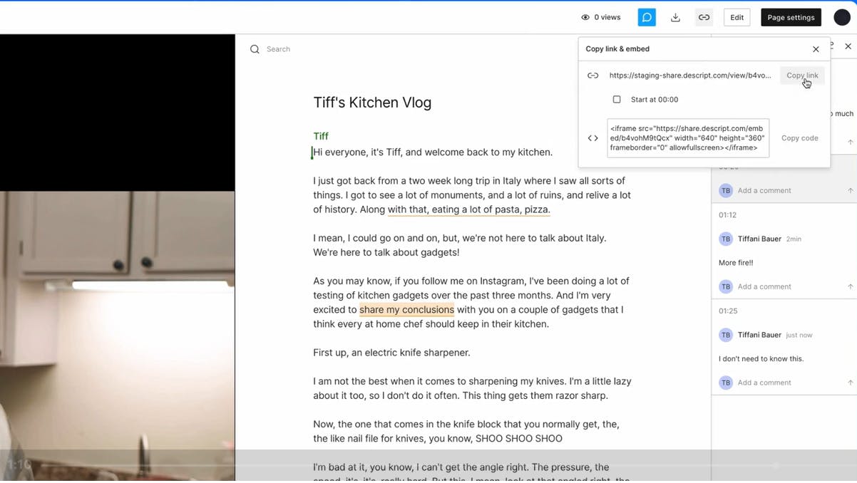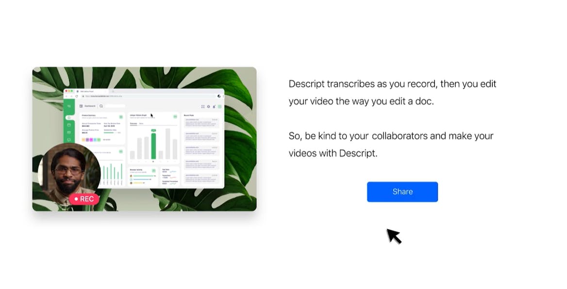 Publishing: Descript creates shareable pages for audio and video with a click to make it easier to share content once produced.