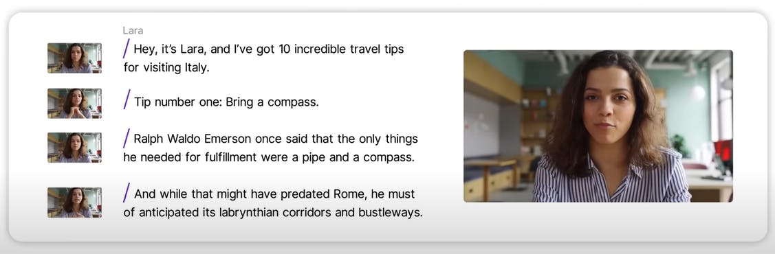 Storyboard: Users can use the “/” key to break transcripts into “scenes” and arrange and edit video content in a slide-like format.