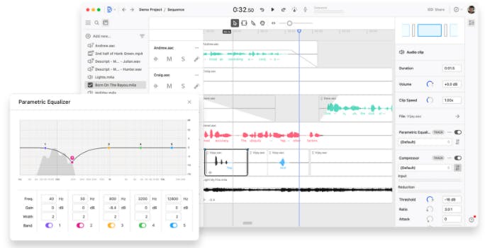 Studio quality sound: Descript supports professional audio quality without requiring expensive hardware. It has noise removal, speech enhancement, acoustic echo cancellation, and sound effects.