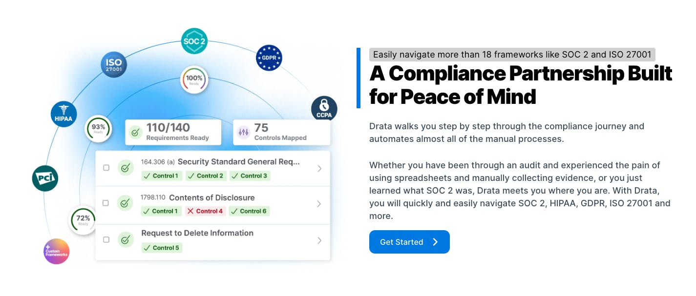 Startups seeking SOC 2 Compliance (or some other framework) for the first time can work with Drata to streamline the process. Patrick de la Garza, VP of Engineering at PolicyDock, a digital insurance company, discussed how preparing the documents himself would have become a full-time commitment that his company could not afford. For startups like PolicyDock, de la Garza commented that “having everything in a centralized location … made everything a lot simpler”, estimating that it has saved his company about 6 months in the SOC 2 compliance process.