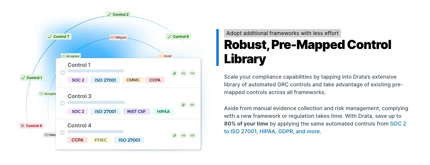 Drata also serves companies looking to automate compliance and risk management as they scale their businesses. Drata provides an “extensive library” of automated GRC controls, with pre-mapped control across all compliance frameworks. Drata also claims it can save companies up to 80% of their time applying automated controls for various compliance frameworks.