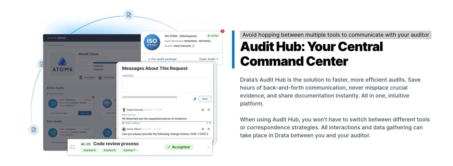 Drata’s Audit Hub allows users to streamline auditing processes with advanced tools and workflows. The hub makes it possible to conduct interactions and data gathering all in one place between users and their auditors, preventing back-and-forth communication and the risk of misplacing crucial evidence. It is intended to enable users to work together with their auditors in real time, thus speeding up the audit process and reducing errors while working within Drata’s platform.