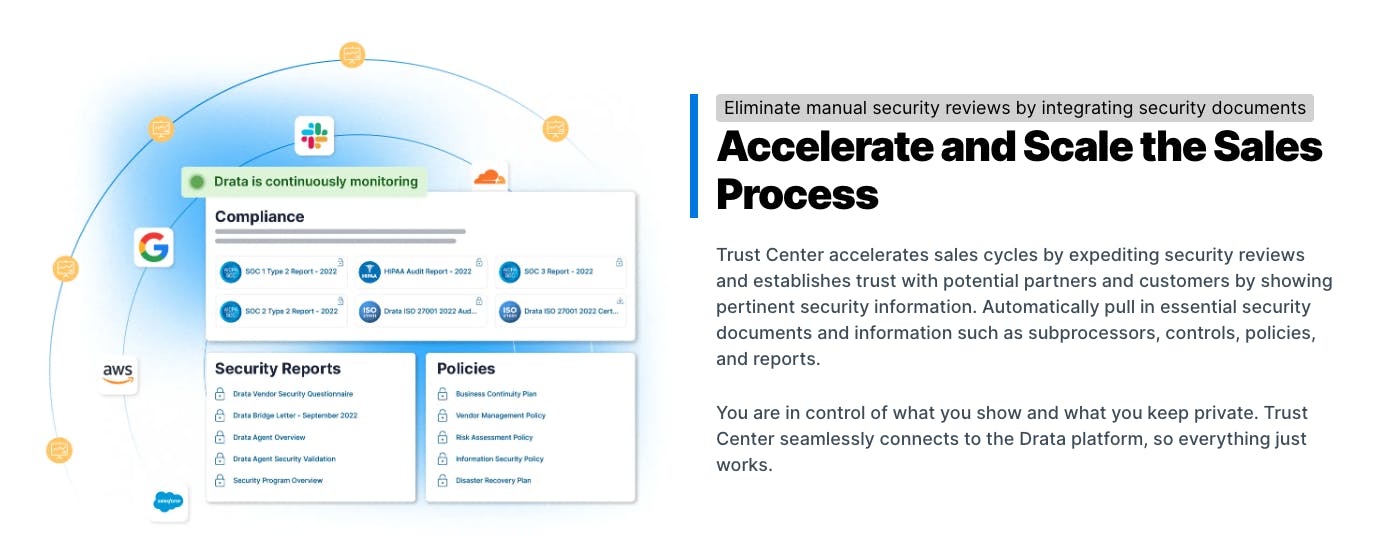 In what Drata describes as a “fast pass to vendor security reviews”, the trust center is intended to accelerate sales cycles with faster security reviews and an easy way to display relevant security information to potential partners and/or customers. The trust center automatically pulls in security documents and information including “subprocessors, controls, policies, and reports”, and users can control what remains private.