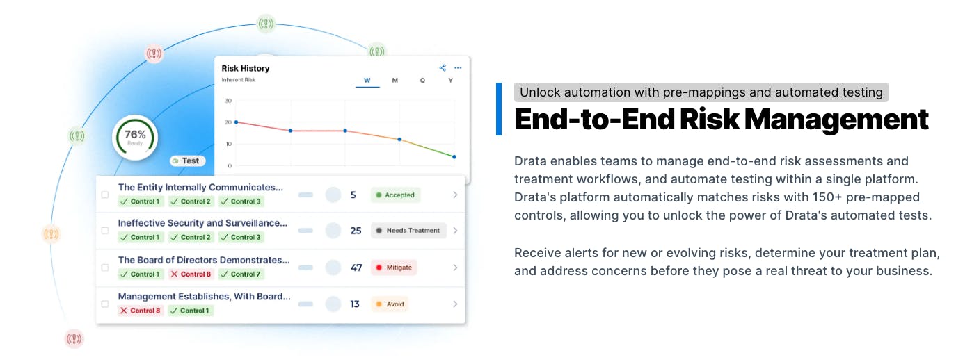 Drata allows users to automatically match risk with 150+ pre-mapped controls, which is intended to help users “put risk management on autopilot”. It provides tools for teams to “manage end-to-end risk assessments and treatment workflows, and automate testing within a single platform.” Users are alerted to new or evolving risks and can use Drata to help develop a treatment plan, align assessment scores, and create risk-related tasks through an integration Drata offers with Jira, an issue and project tracking software provider.