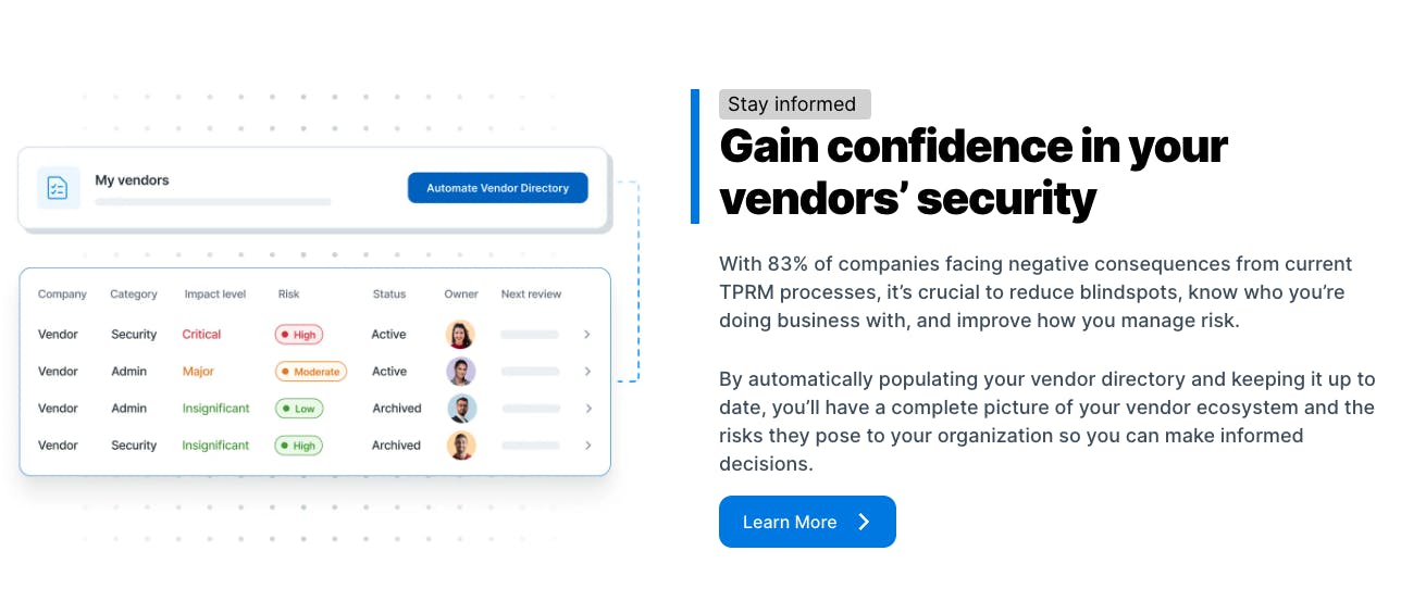According to Drata, 83% of companies face negative consequences from existing third-party risk management (TRPM) processes. Drata allows users to automatically populate and update vendor directories to provide “a complete picture of your vendor ecosystem and the risks they pose”.