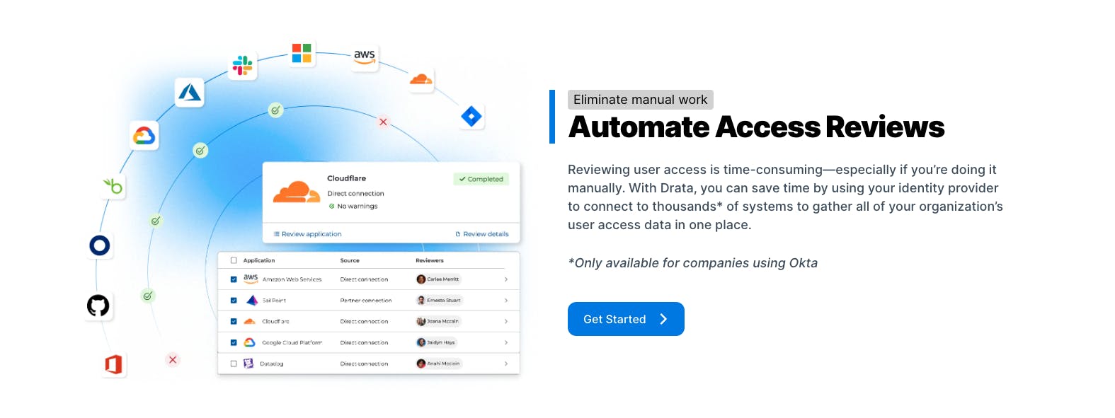 Drata allows its customers to conduct automated, regular user access reviews directly within Drata. Companies using Okta can connect to thousands of systems to centralize user access data across an organization. The automation of such reviews is intended to reduce unauthorized access and the risk of data breaches while remaining compliant.
