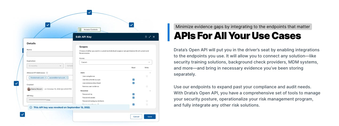 Drata’s Open API allows users to connect their security programs “without compromising automation” by enabling integrations to endpoints or solutions such as security training solutions and background check providers, among others.