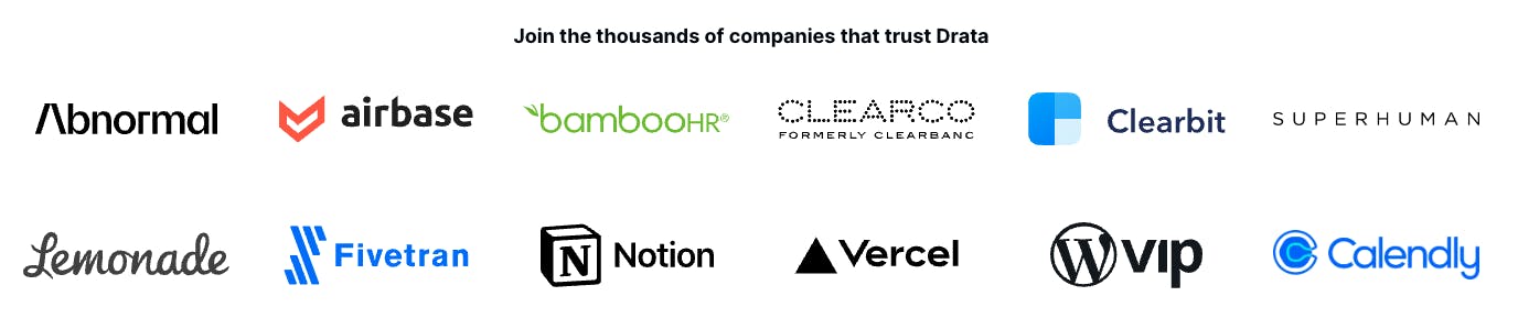 Notable startups using Drata as of December 2023 include Airbase, Fivetran, Notion, Vercel, Calendly, and Superhuman.