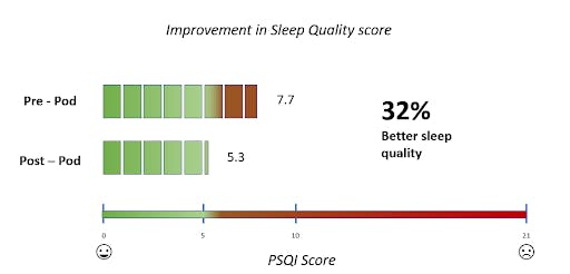 Eight Sleep’s products’ value proposition is to improve sleep quality, and it has conducted studies to demonstrate its products’ ability to do just that. In one study the company conducted, 50 participants were asked to fill out a Pittsburgh Sleep Quality Index (PSQI) questionnaire before and after sleeping on the pod. The PSQI determines sleep quality on a scale from 0 to 21. Scores below 5 indicate “good sleep quality” while scores above 5 indicate “poor sleep quality”.
